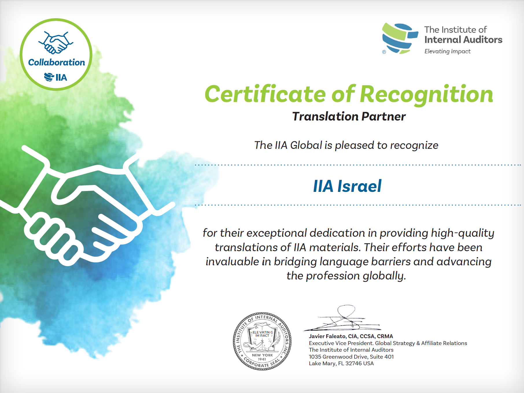 תעודת הוקרה מלשכת המבקרים הפנימיים העולמית (IIA) על השותפות בתרגום התקנים המקצועיים הגלובאליים וההנחיות המקצועיות